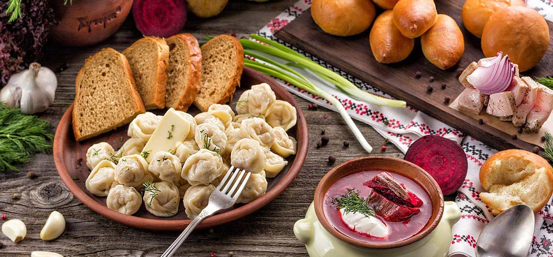 La comida en Rusia es muy variada, tiene una gran cantidad de platos típicos del país. Como el clima de Rusia casi siempre es frío, la mayoría de los platos se consumen calientes. La Sopa es uno de los platos principales, hay muchos tipos. Las carnes más comunes son el pescado, el gamo y las aves de corral, además, en muchos platos también están presentes las setas, frutas del bosque y miel.